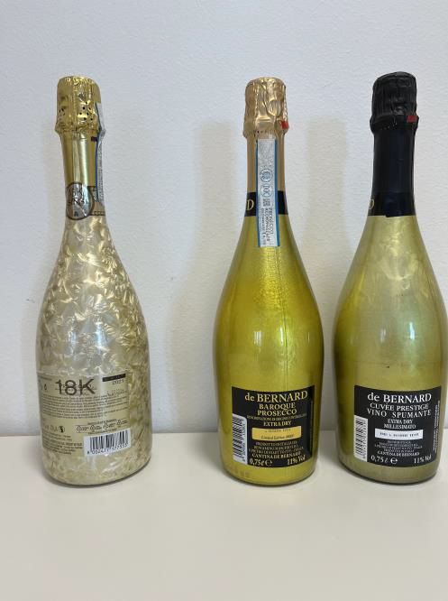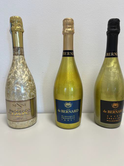 The wine brand known as "Prosecco Sensi" presents a distinct visual aesthetic with its metallised marbled or "ice" texture, setting it apart from the reflective and glossy appearance of the "Maschio Beniamino" bottles