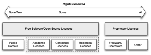 Come illustrato in una scheda informativa dell'IPR dello scorso anno, esistono tre principali categorie di licenze, quelle proprietarie, quelle "free" e quelle "open source", che hanno varie gradazioni di protezione come illustrato in questa figura: