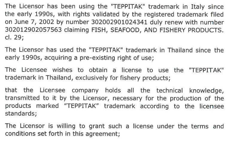 A domanda del Giudice, il rappresentante legale della Ricorrente ha dichiarato di aver intrattenuto con CP_4 un rapporto di distribuzione/fornitura a partire dalla fine degli anni ‘80; il difensore dell’Attrice ha esibito contratto di licenza esclusiva tra CP_3 e Teppitak Seafood del 17.12.2017, fonte di un rapporto di licenza tra CP_3 (licenziante) e CP_4 (licenziataria) avente ad oggetto l’uso esclusivo del marchio CP_4 registrato nel 2002 nonché i documenti che rappresentano l’arrivo di ulteriori carichi.