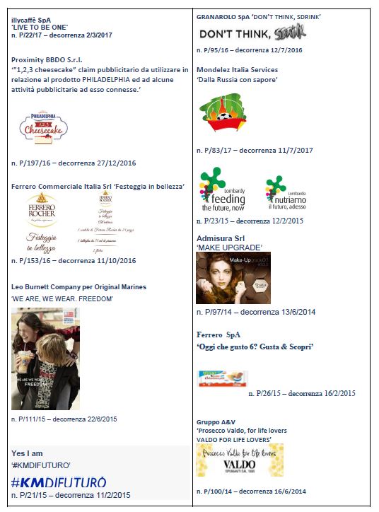 Ed ancora 'Breath Clay - Respiro d'Argilla' “Breath Clay – Lambrusco Wine” del Consorzio Tutela Vini Emilia, segni tutelati come marchio e come slogan nel 2014 per la campagna di comunicazione Breath Clay – Lambrusco Wine; ed ancora “PIÙ e MENO” e “GUSTO & BENESSERE” tutelati entrambi nel 2015 come marchi e slogan dalla Società Gruppo Fini Spa .