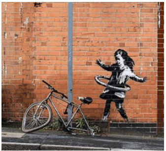 Recentissima pubblicazione, sul profilo Instagram di Bansky è quella di una bimba intenta a giocare all’hula-hoop con uno pneumatico da bicicletta su un muro esterno di Nottingham, Gran Bretagna.