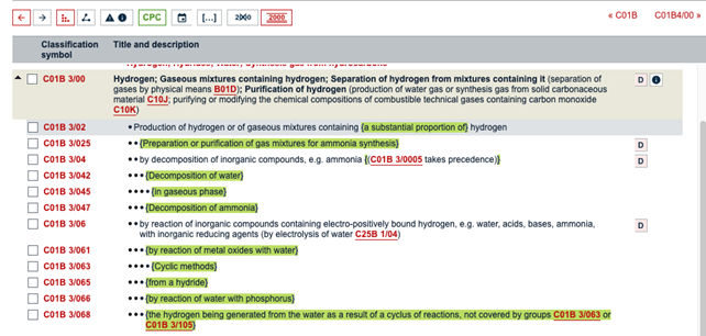 Un esempio è riportato nella figura 1: C01B 3/042 e C01B 3/047 hanno lo stesso livello gerarchico, mentre il sottogruppo C01B 3/042 è superiore al C01B 3/045.