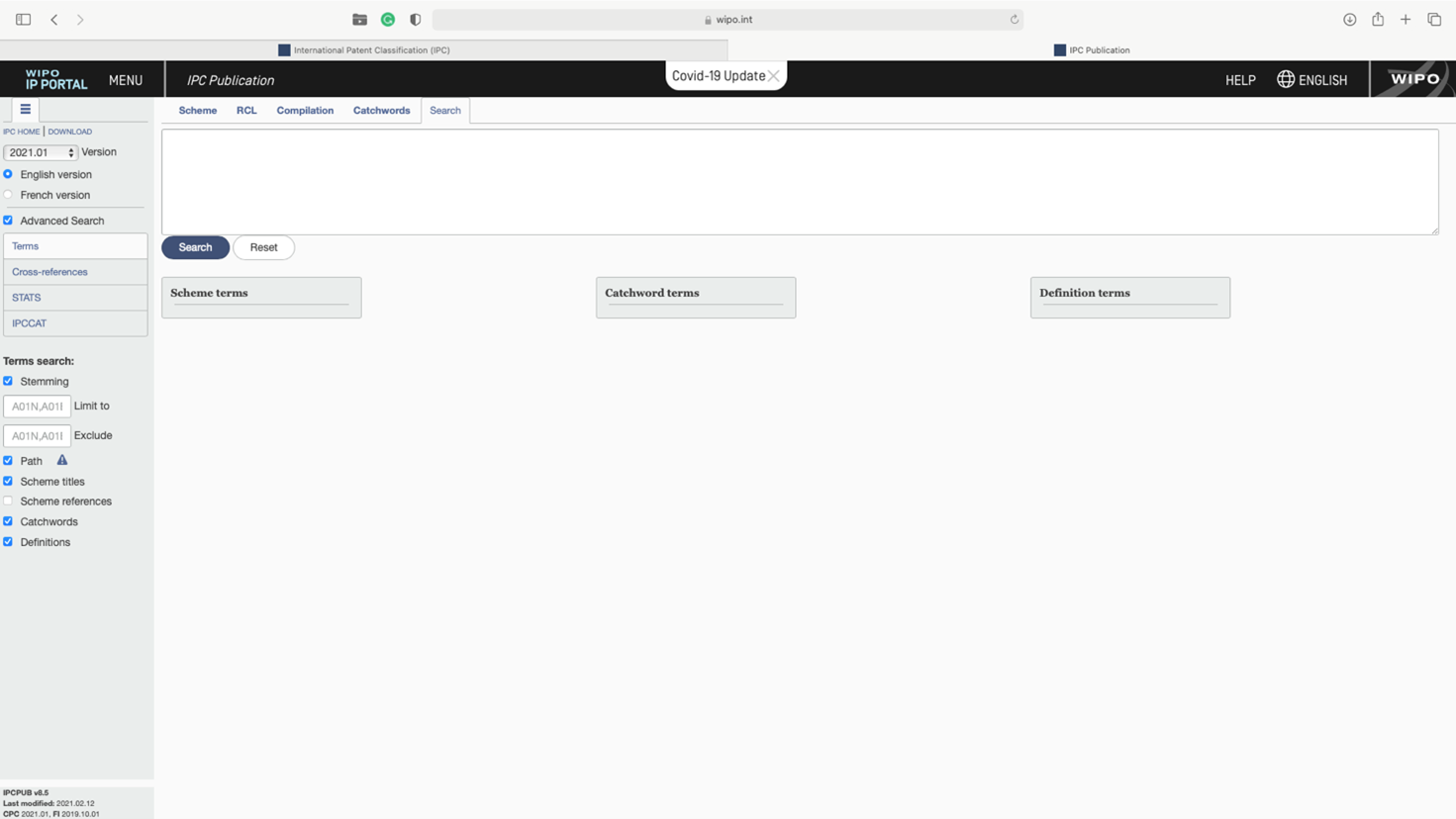 Figura 1 – Schermata di ricerca dei codici IPC (WIPO)