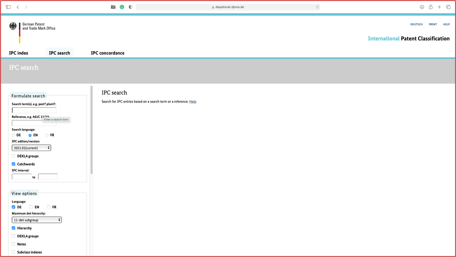 Un altri ufficio nazionale che consente la ricerca dei codici IPC è quello tedesco (DPMA). Le modalità di ricerca sono due: attraverso un indice oppure per parole chiave (Figura 3)