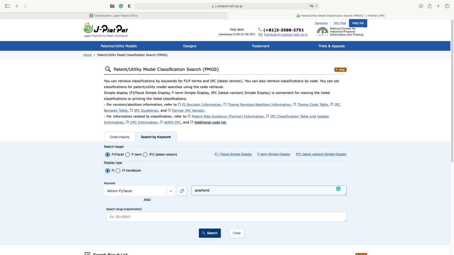 La ricerca può essere effettuata utilizzando sia codici di classificazione sia parole chiave (https://www.j-platpat.inpit.go.jp/p1101) – Figura 1