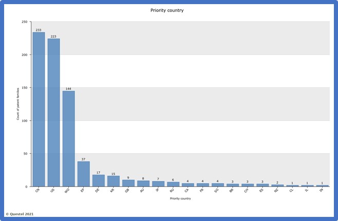 L’analisi delle domande di brevetto di priorità dimostra come Cina e Stati Uniti siano i principali (e direi unici) concorrenti in questo settore emergente (v. Figura 1)