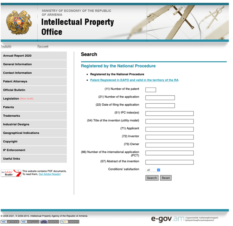 Consideriamo, per esempio, il database per la ricerca dei brevetti registrati in Armenia.