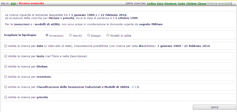 La ricerca dei dati, sulle domande depositate a partire dal 1° gennaio 1980, è possibile in vari campi: codice, data, provincia, testo, titolare, classe (IPC) e avanzata.