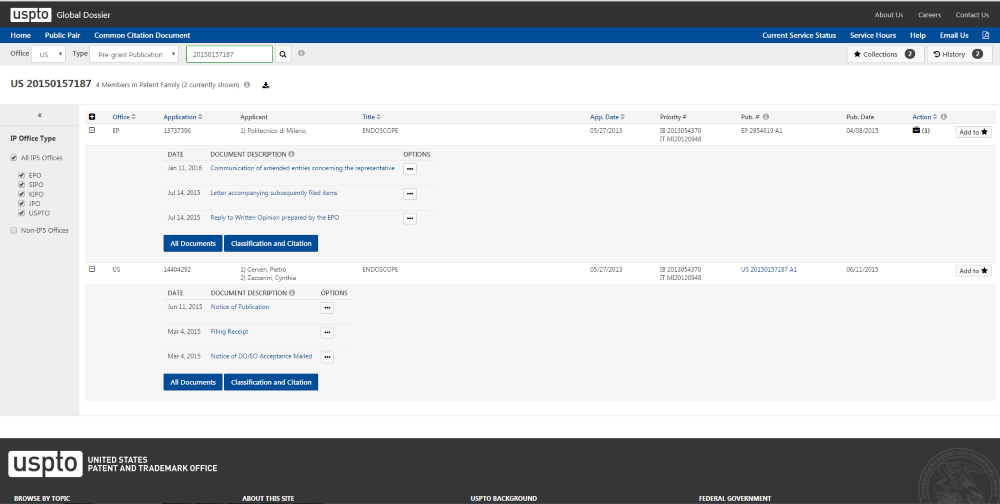 Il sito consente di reperire informazioni sulla prosecuzione di una famiglia brevettuale depositata presso uno dei seguenti uffici brevetti nazionali e/o sovranazionali: Stati Uniti, Cina, Corea del Sud, Ufficio Europeo Brevetti e Giappone.