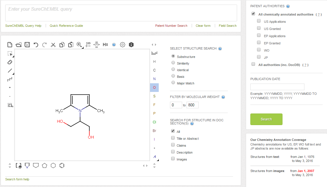 La banca dati SureCHEMBL è gratuita e consente di ricercare formule chimiche di struttura (esatte, parziali o similari) mediante un’apposita applicazione utilizzabile direttamente dal browser.